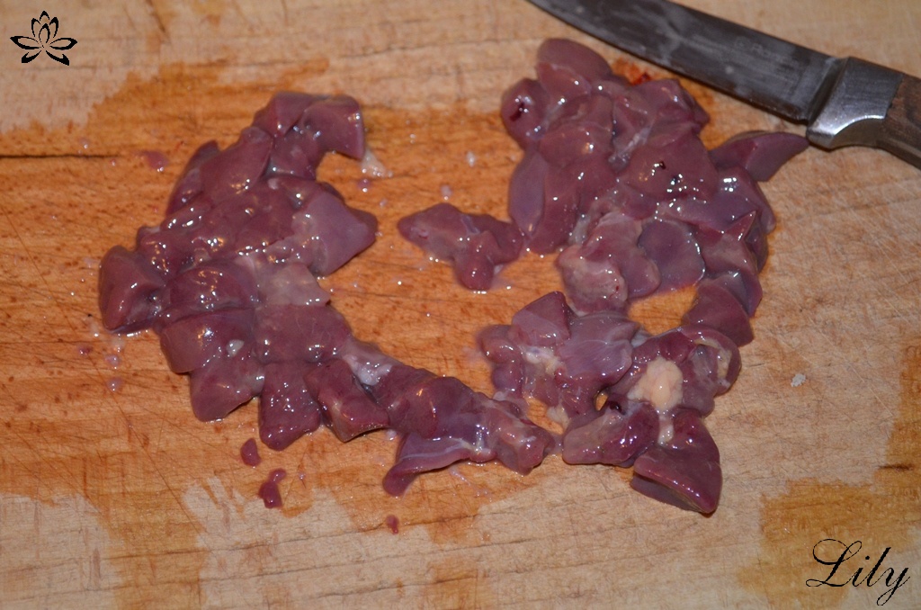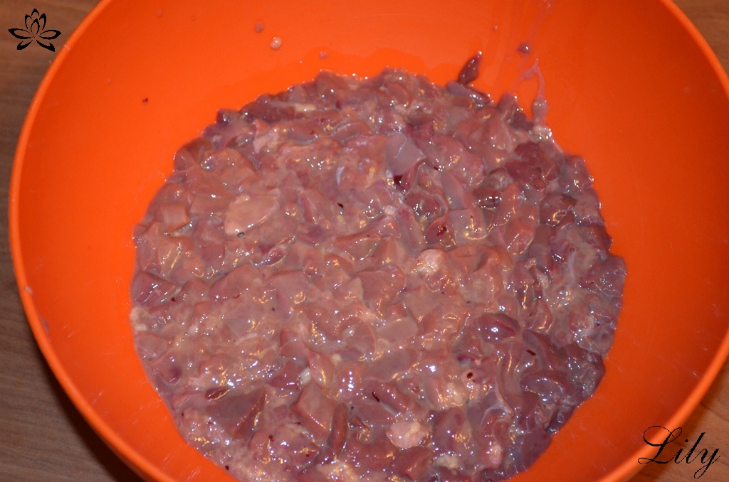 Печенку нужно зачистить от пленок, порезать кубиком.