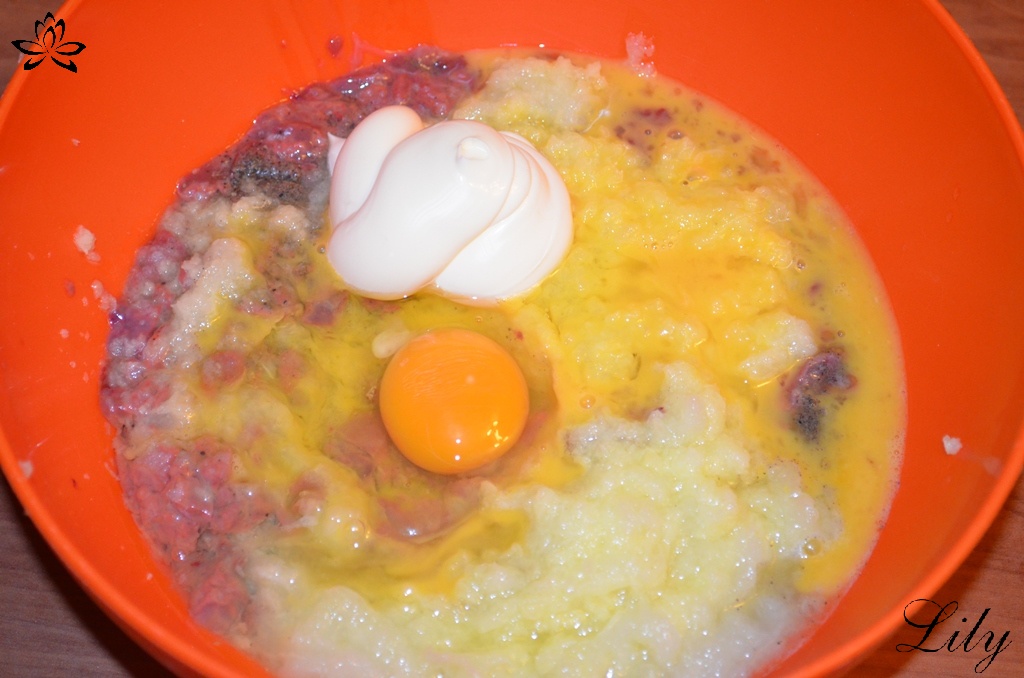 К печенке добавляем тертый лук (и картошку, если будете ее класть), яйцо и майонез. Солим, перчим по вкусу. Добавляем сухой чеснок, если есть желание.