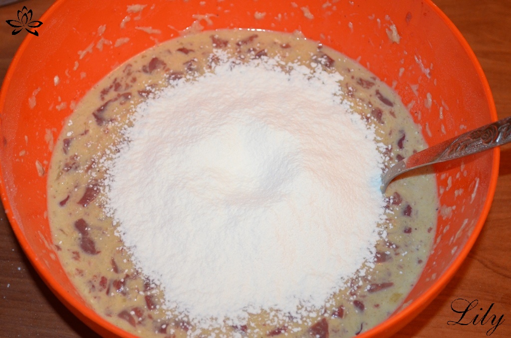 Добавляем муку и смешиваем все до однородной массы