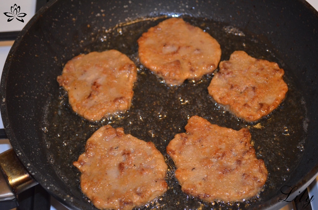 Жарить как обычно. Выкладываем куриную массу ложкой на сковороду с растительным маслом.